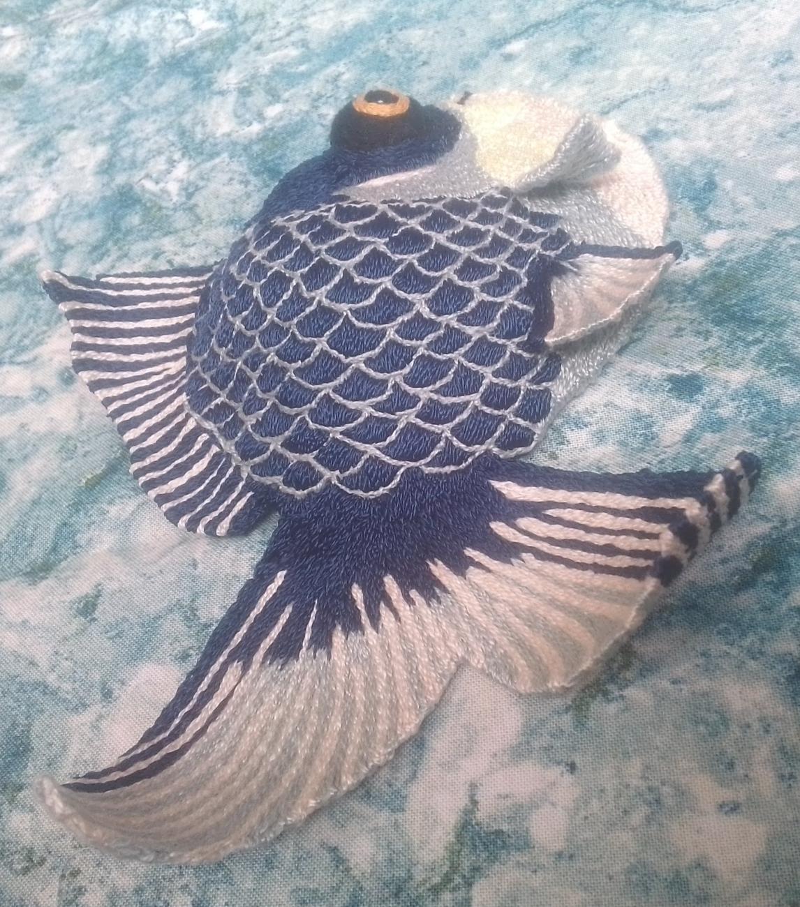 This is half of the large "Black Goldfish" model provided by Epson and designed by Chan See Lik Paul. I was intrigued by the construction of the eye, which stands out a lot from the body. However, I didn't feel I had enough practice at making 3D models to try making both sides, and also I thought a flat version would be easier to display. It's just been placed on some fabric here. I've added another photo, with a side view, which shows the extent to which the eye protrudes from the body.