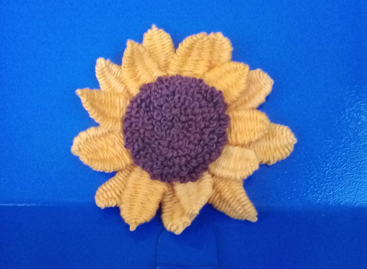 I saw a video by Sarah Homfray which suggested using woven picots for the petals of a sunflower (the fifth of the ideas, I think). I'd never tried this stitch before, so it seemed like an interesting challenge, particularly as I wanted to make the flower without a large fabric backing . This way, I could make two overlapping layers of woven picot petals. The flower is made in three layers. The smallest is the central circle of French knots. Beneath that is a circle of fabric with woven picots attached to its outer rim and behind that is a slightly larger circle (with a diameter of about 4cm), also with woven picots attached. I then sewed all three layers together.